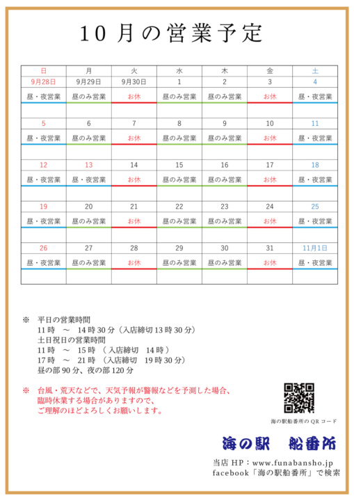船番所ブログ 令和7年10月の営業予定 2025/09/28 最近急に秋らしくなり、過ごしやすくなりましたね。これからは、お出かけしやすい時期になります。 10月の営業予定です。よろしくお願いします。 船番所ブログ一覧