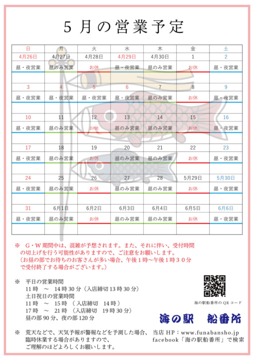 船番所ブログ 令和8年5月の営業予定 2026/04/26 最近は雨ばかりで梅雨みたいですね。さて、5月の営業予定です。G・W中は混雑します。お待ちのお客様が多い場合、受付時間の切上げを行う場合がございますので、ご注意ください。 船番所ブログ一覧